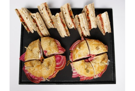 Plateau Lunch n°1 froid : 16 pièces (8 minisclub sandwichs tomates séchées et fromage frais et 8 quart de baggels au carpaccio daurade et crudités)