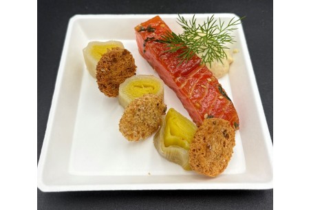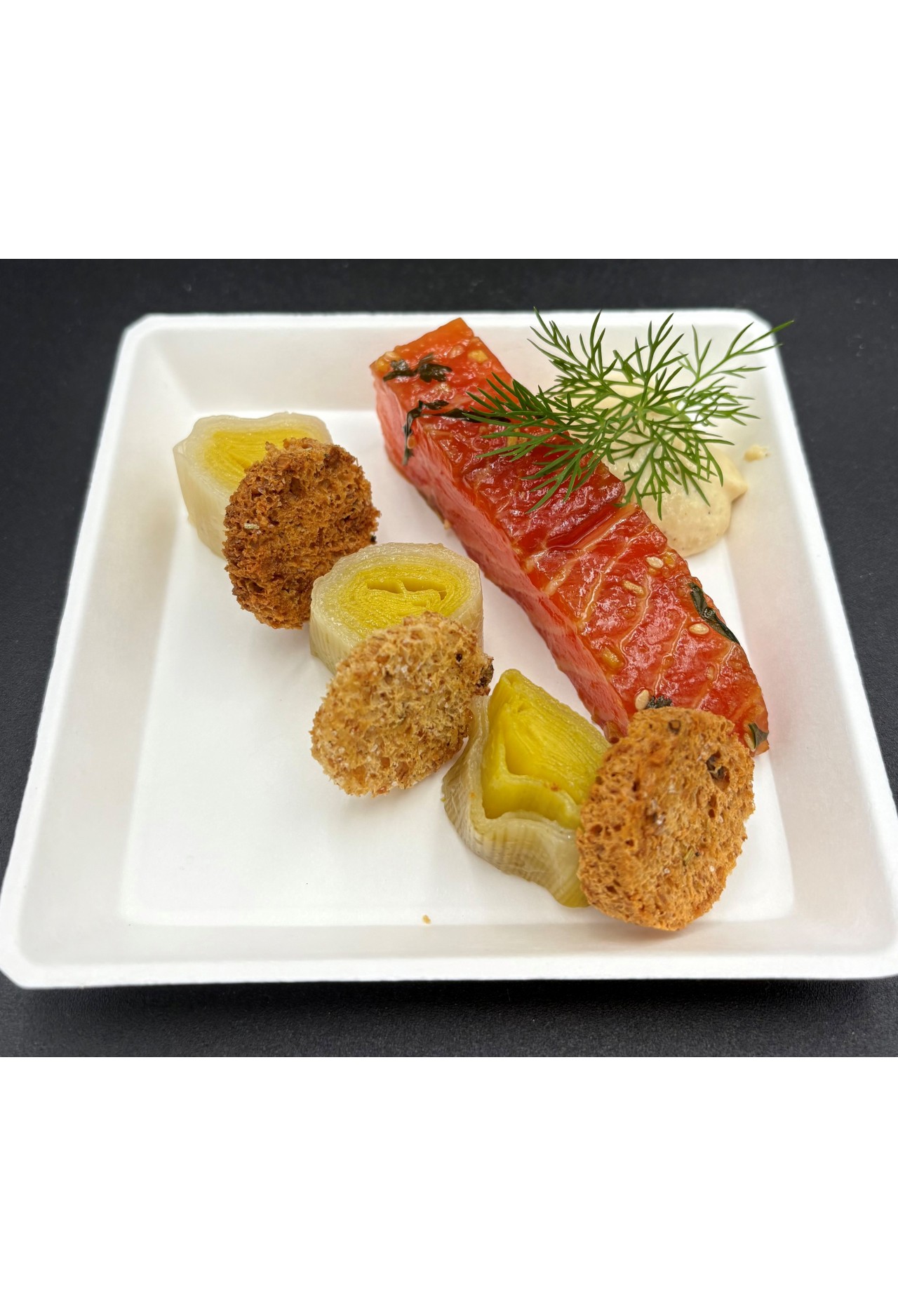 Ingrédients: tofu, citron, vinaigre de riz, moutarde, soja, sésame, miel, coriandre, ail, gingembre, farine, céréale, poireau, saumon / Conservation +3°c
