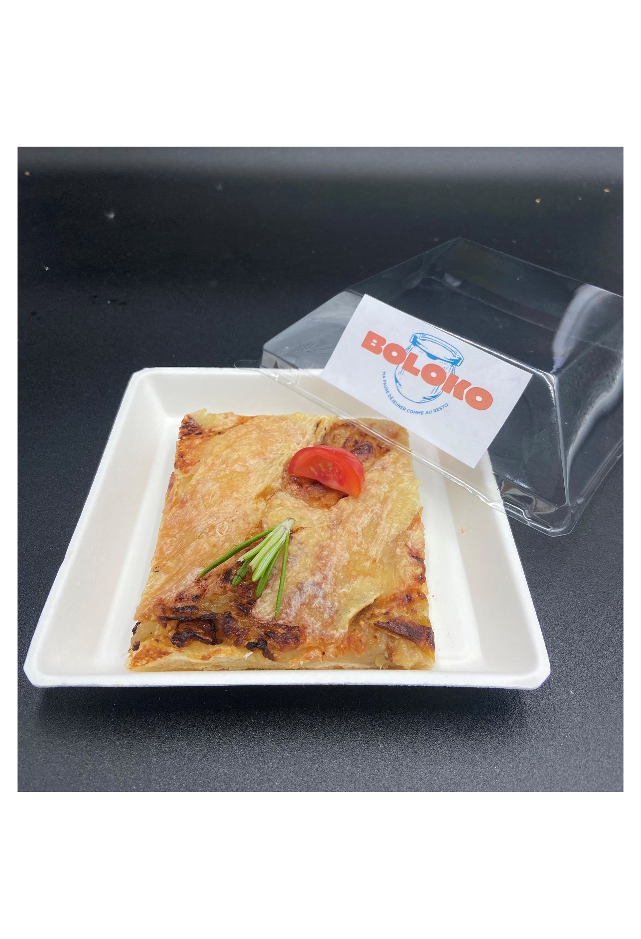 Ingrédients: oignon, huile d'olive, beurre, sel, poivre, herbes aromatiques, thym, farine; œuf, tomme, tomate