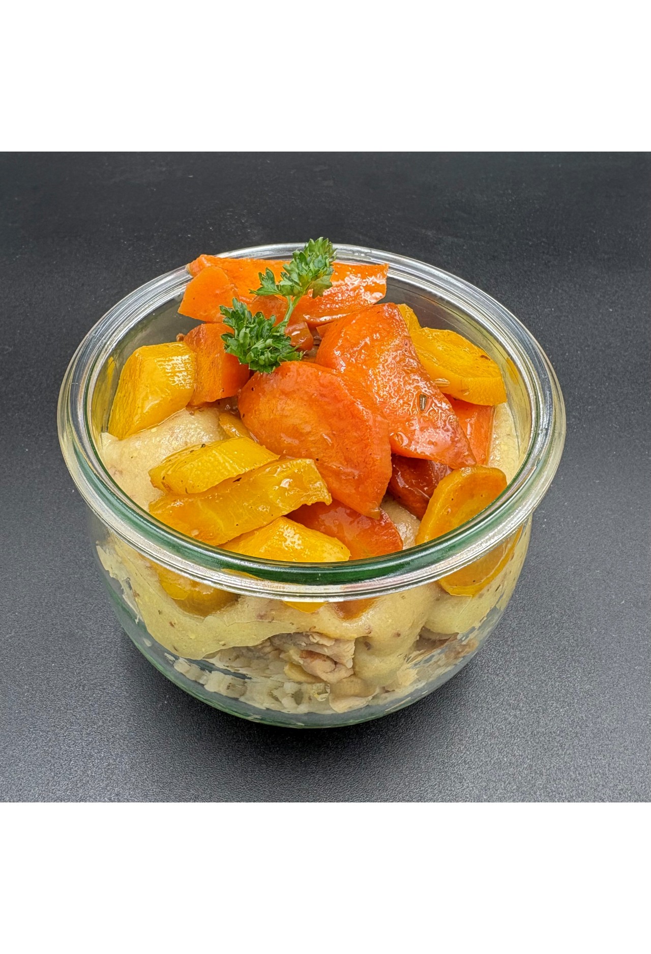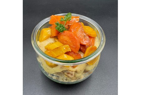 ingrédients : poulet, huile d'olive, sel, poivre, herbes de provences, alcool, riz, beurre, farine, moutarde, carottes, persil, ciboulette, crème, jus de cuisson de poulet, graisse de poule, fécule de pomme de terre, blé, œuf, sel, levure, sucre, antioxydant, oignon