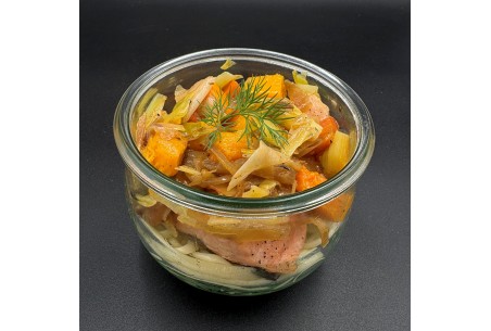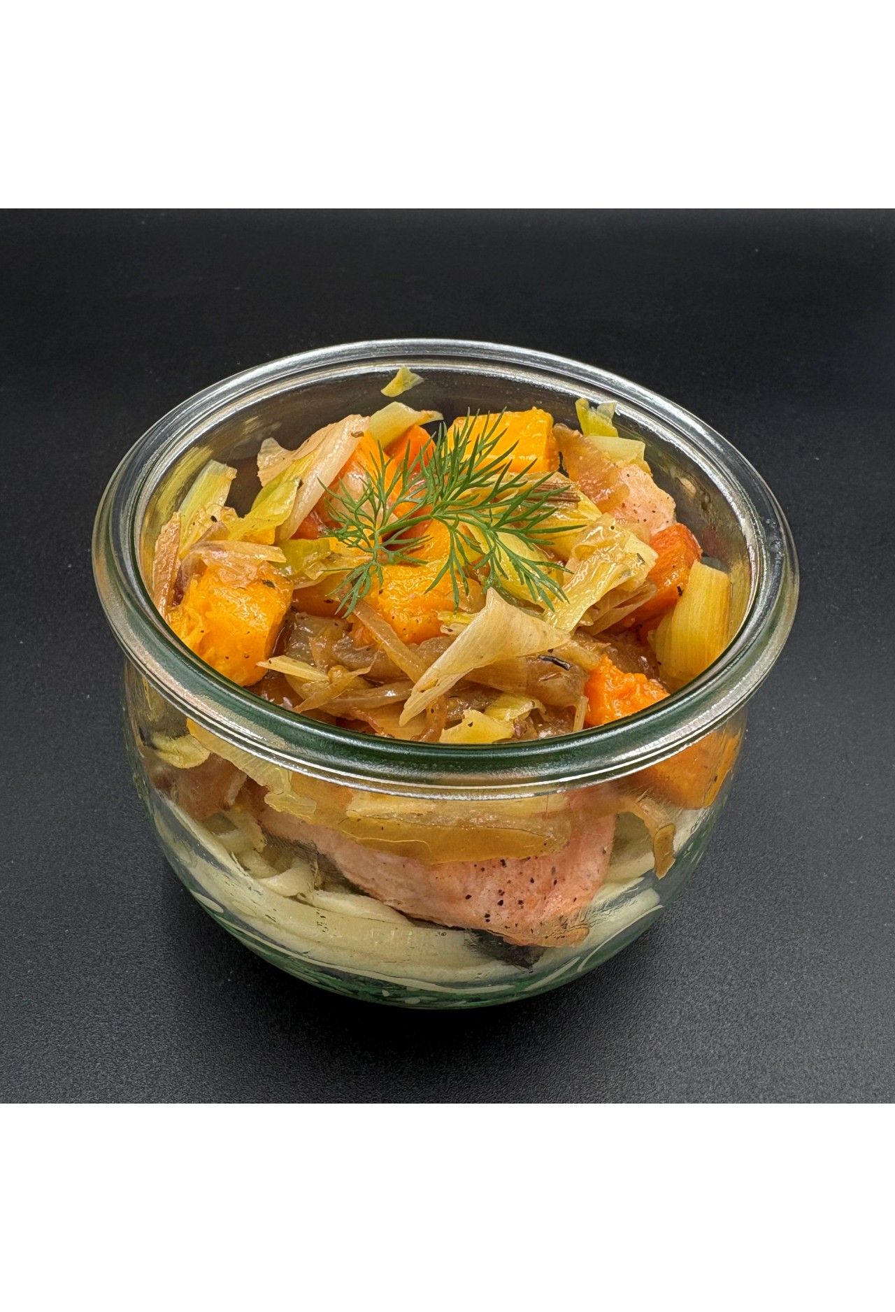 Ingrédients: Truite, beurre, huile d'olive, sel, farine, œuf, eau, carotte, poireau, butternut, oignon
