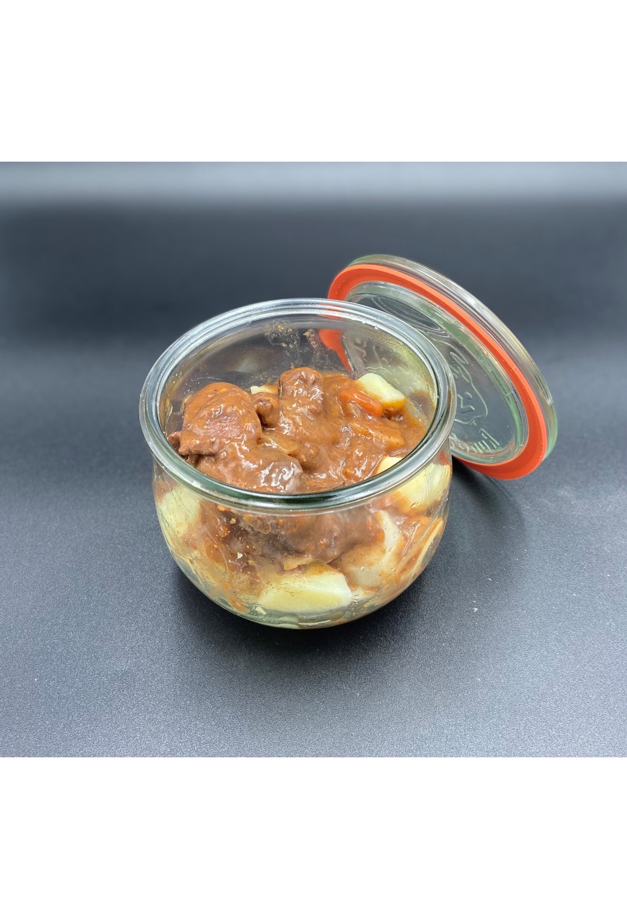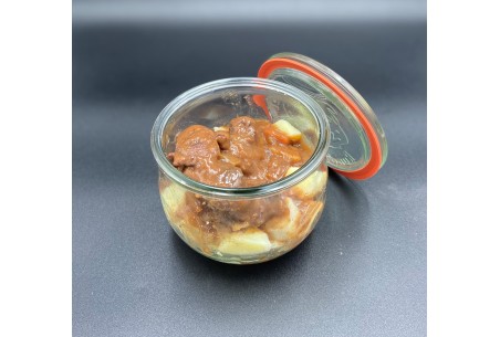 Ingrédients : bœuf, herbes aromatiques, sel, poivre, vin rouge, carotte, huile d'olive, beurre, ail, thym, laurier, gomme xantham, tomate, arôme patrelle, fécule de pomme de terre, blé, œuf, levure, sucre, antioxydant, jus de cuisson veau, carotte